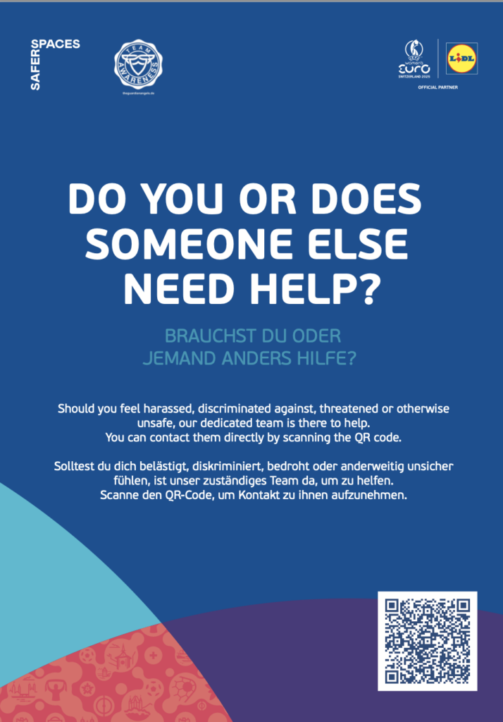 Als Senior Project Lead durfte ich das Awarenesskonzept für UEFA Womens EURO 2025 konzipieren und durchführen. Gemeinsam mit einem großartigen Team haben wir in monatelanger Arbeit das umfangreichste Awarenesskonzept für eine Sportveranstaltung der Welt umgesetzt. Wir waren 4 Wochen lang jeden Tag mit einem tollen Team in einem von 8 Fußballstadien in der Schweiz und haben Awarenessarbeit geleistet. Auch das, war ein großes Herzensprojekt von mir.